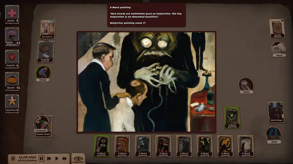 A rich variety of interaction mechanics All these artistic, amusing, horrible or lustful details of life are represented as lovingly painted cards that can be combined, collected, talked or thought about, visited, read or interacted and so on, resulting in a vast diversity of results, creating new cards and new opportunities of interaction. The creation of this game was inspired by a cult classic of similar format, but different vibes. Mortal challenges Life of the artist is not easy. Poverty, physical ailments, sanity loss and other challenges regularly result in permadeath (a variety of permadeaths, beginning with dying to disease and ending with drinking oneself to death), followed by a tactful overview of your life (often miserable, addiction-fuelled, yet passionate) and legacy. During your life, unpleasant feelings will evolve from bad to worse if not dealt with. You will have to battle conditions like frustration, anxiety, anger, guilt, sadness, suicidal thoughts, and multitudes of other issues, including habits, addictions and temptations of various kind.