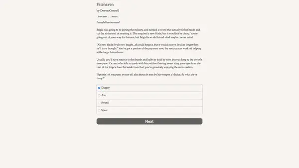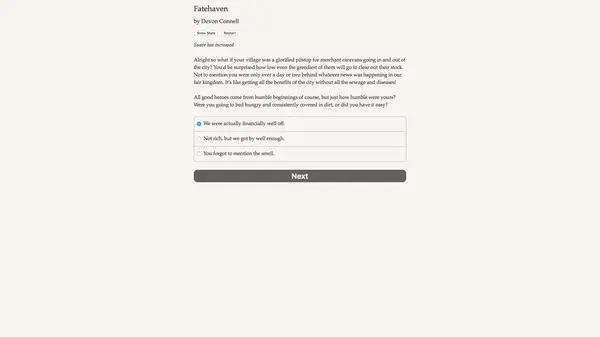 “Fatehaven” is a 110,000-word interactive fantasy novel by Devon Connell, where your choices control the story. It’s entirely text-based–without graphics or sound effects–and fueled by the vast, unstoppable power of your imagination.